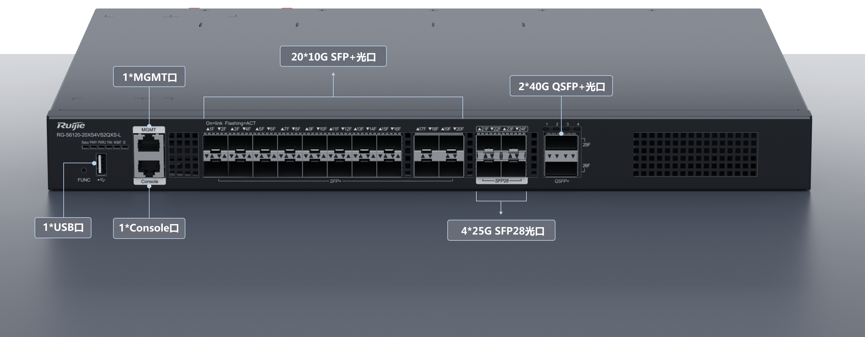 RG-S6120-L系列交换机是锐捷网络新推出的高性能、强安全的新一代万兆以太网交换机,该系列交换机采用先进的硬件架构设计,搭载锐捷网络新的模块化操作系统,提供更快的硬件处理性能、更便捷的操作使用体验。